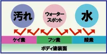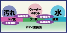 従来のガラス系やポリマーなどの有機系コーティング剤は、分子同士が強く結合しており表面張力が高いため、ボディ塗装の分子のすき間まで十分に浸透できません。